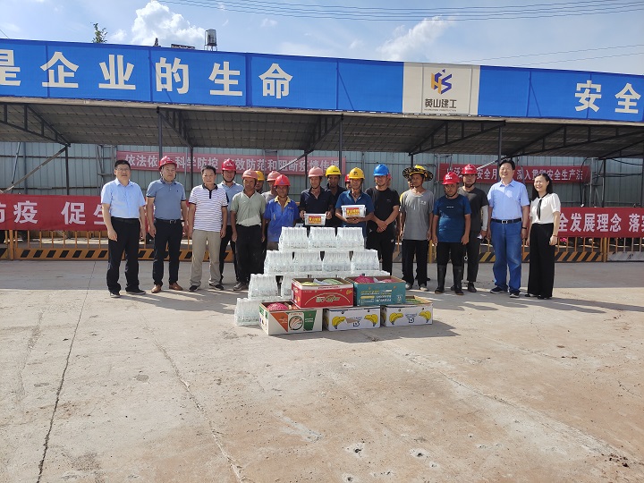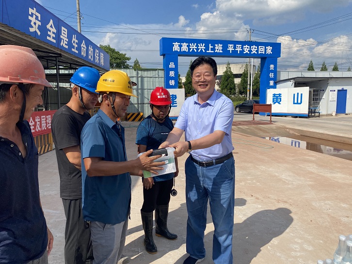 在黃山市南部城鎮(zhèn)群水務調(diào)度中心項目、黃山生豬定點屠宰加工及配套設施項目及配套冷鏈項目施工現(xiàn)場,城投集團總裁黃世穩(wěn)、黨委副書記汪蓉、副總裁朱愛民等一行將慰問品送到一線職工手中,并和大家親切交談,細致了解大家的生活工作情況,總裁黃世穩(wěn)叮囑要注意勞逸結(jié)合,合理安排作息時間,做好防暑降溫工作,確保實現(xiàn)安全生產(chǎn)。